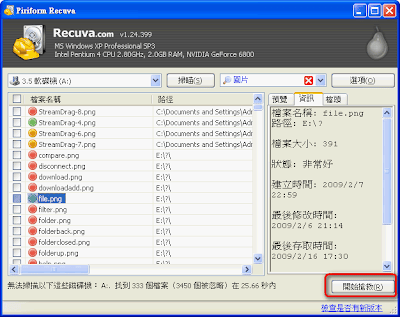 最後,會問您是否啟用深層掃描。若啟用深層掃描,時間會非常地久,但是若刪除的資料是放在被重新格式化或是被重新分割的硬碟中,則有機會被救回。而選擇掃描型態後,按〔開始〕就會開始掃描了。